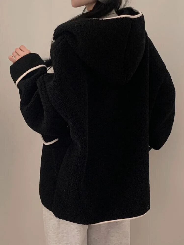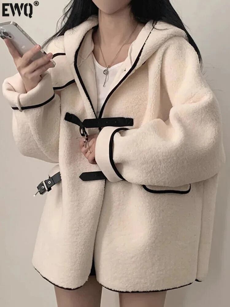 [EWQ] フード付きラムウールコートルースパッチワークレザーバックル長袖ジャケット秋冬 U6619 ロング オータム 秋物 ウィンター 冬物