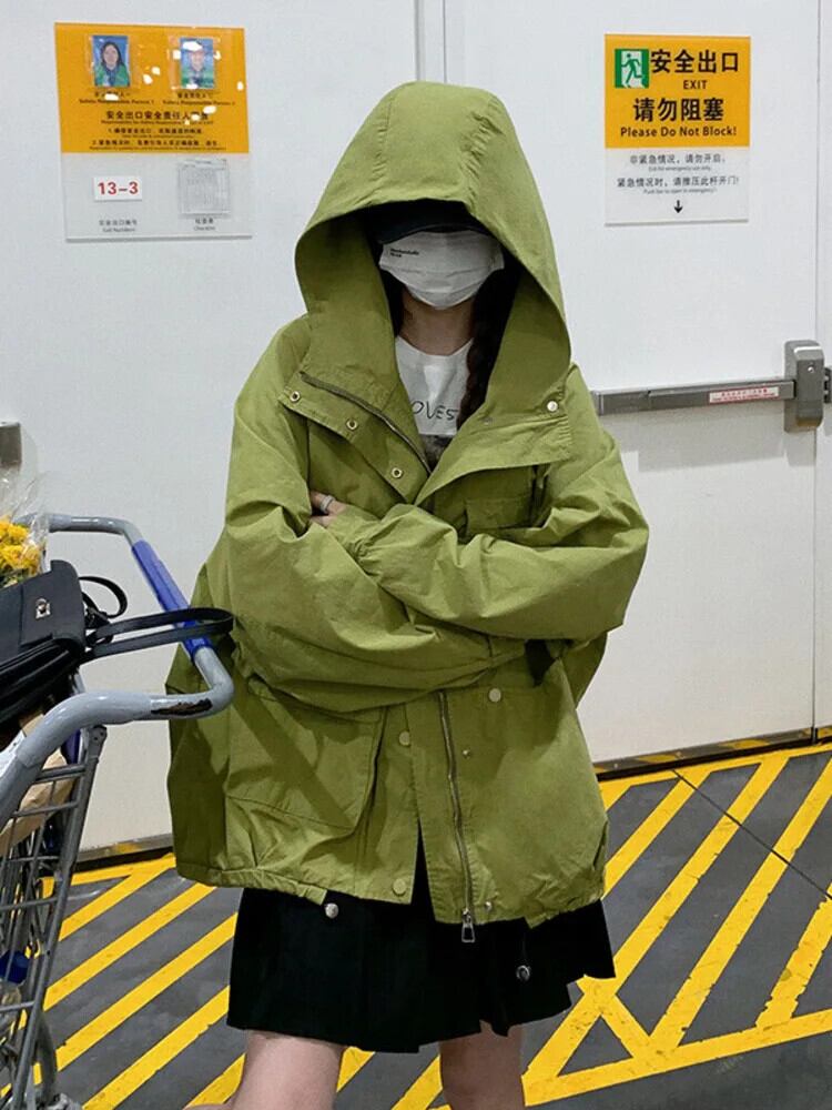 [EWQ] グリーン フード付き シングルブレスト ポケット ジャケット 婦人 コート トップス 秋冬 16U6694 オータム 秋物 ウィンター 冬物