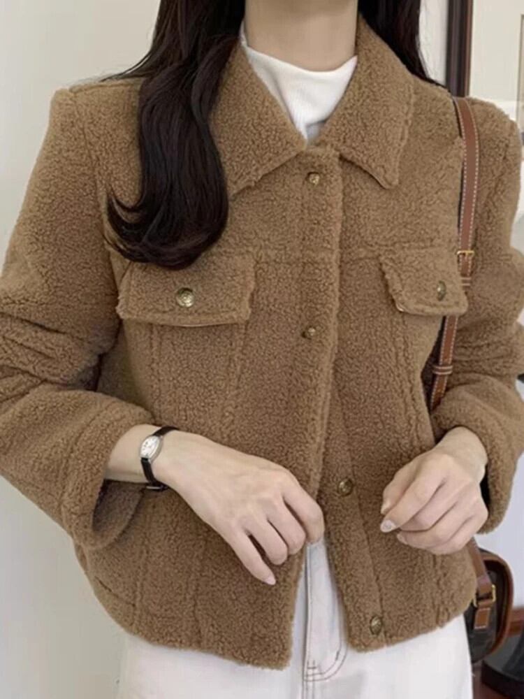 [EWQ] レディース ラペル シングルブレスト フェイクラムウール ゆったり 万能 厚手 暖かい 長袖 コート ジャケット 秋冬 16U6672 ロング オータム 秋物 ウィンター 冬物 ファー
