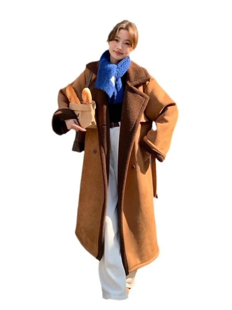 [EWQ] ラペル ダブルブレスト レースアップ 厚手 暖かい ラムウール コート レディース スエード アウター 冬 16U6695 スウェード ウィンター 冬物