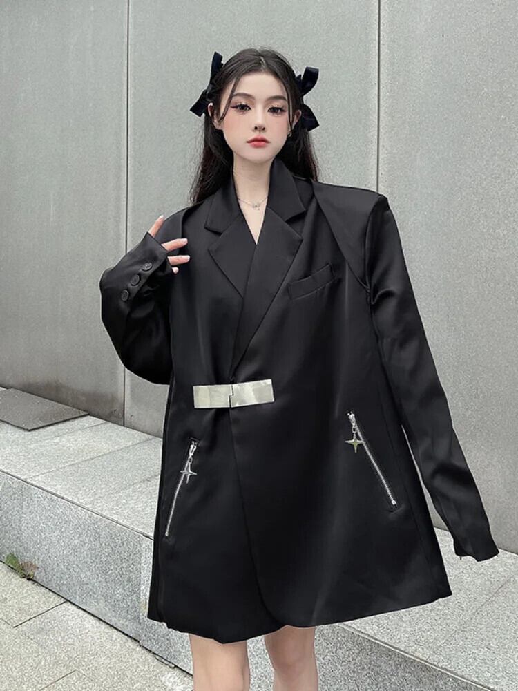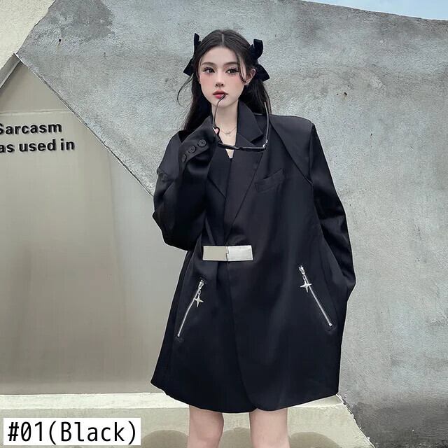 [EWQ] 気質ラペルメタルバックルスーツジャケット黒ジッパーポケットブレザーコートトップ秋冬 6U6713 ブラック オータム 秋物 ウィンター 冬物