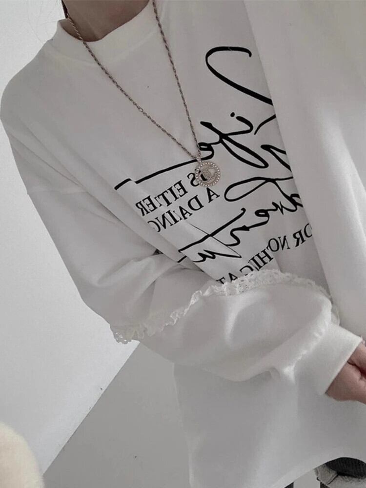 [EWQ] シンプル ラウンドネック レタープリント パッチワーク レース ゆったり オールマッチ 長袖 Tシャツ ウォムネ 春秋 16U6611 ロング スプリング 春物 オータム 秋物 Oネック