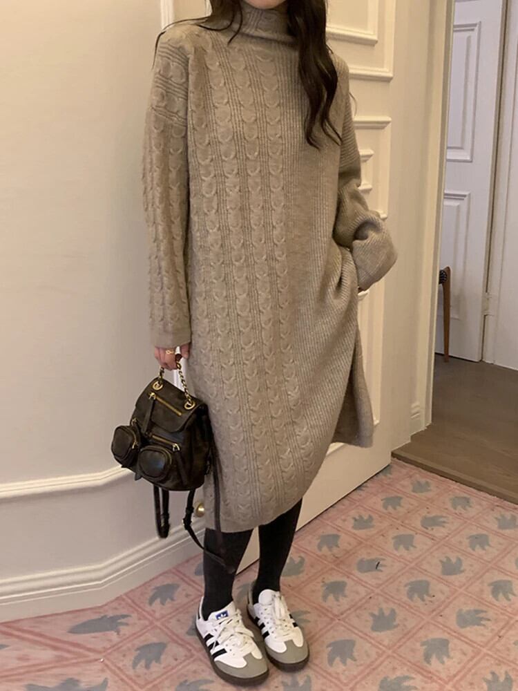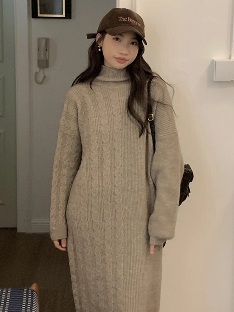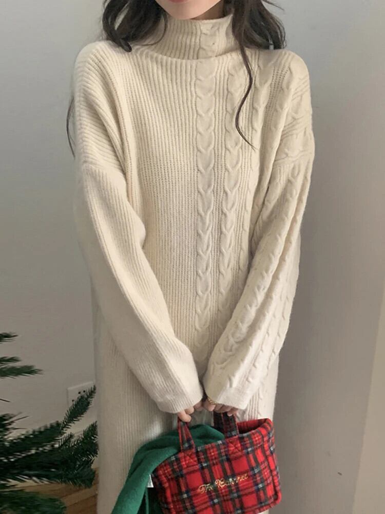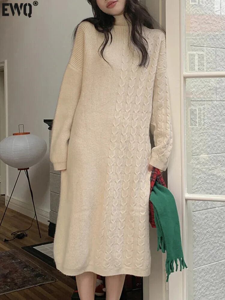 [EWQ] タートルネック リネン ツイスト ストライプ ルーズ 長袖 ニット セーター ドレス レディース 秋冬 16U6670 ロング オータム 秋物 ウィンター 冬物