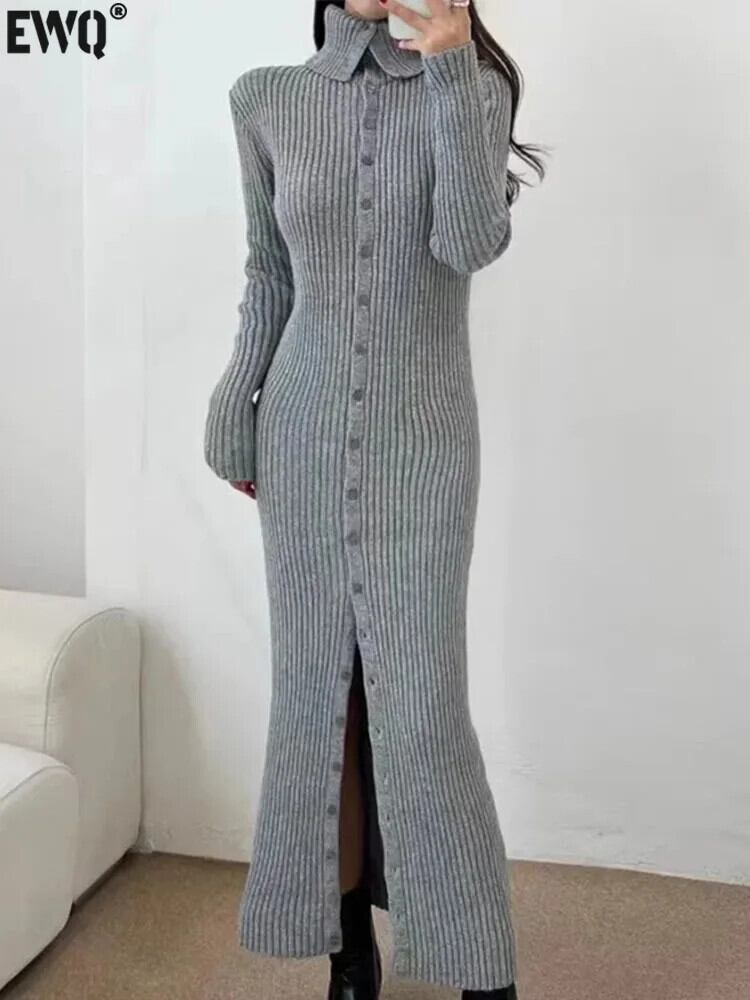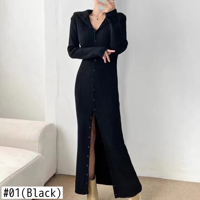 [EWQ] ラペルシングルブレスト無地ウエストゴムスリムニットカーディガンロングドレス秋冬 16U6613 エラスティック 伸縮 オータム 秋物 ウィンター 冬物 ソリッドカラー