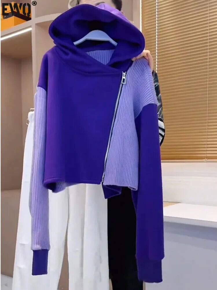 [EWQ] ストリート コントラストカラー ジッパー レディース フード付き トレーナー 長袖 ニット トップス 秋冬 16U6720 ロング オータム 秋物 ウィンター 冬物
