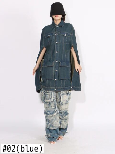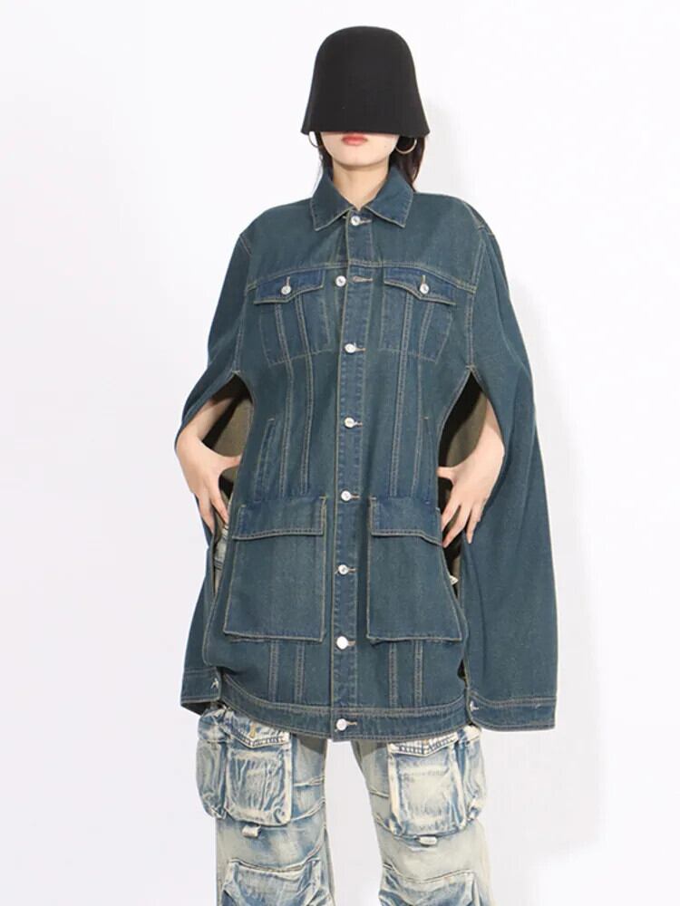 [EWQ] ラペルマントスリーブスプライシングシングルブレストストリートコートパッチワークポケットシックデニムコート 16U520817