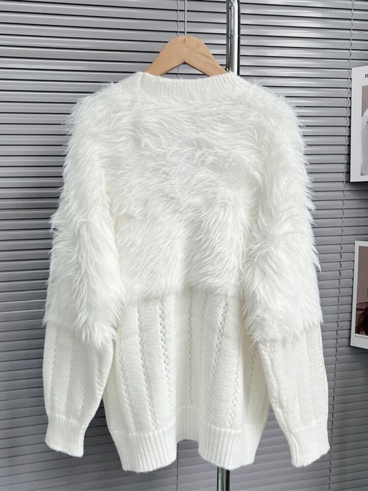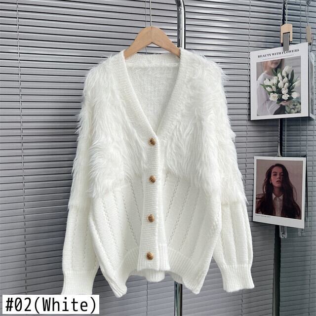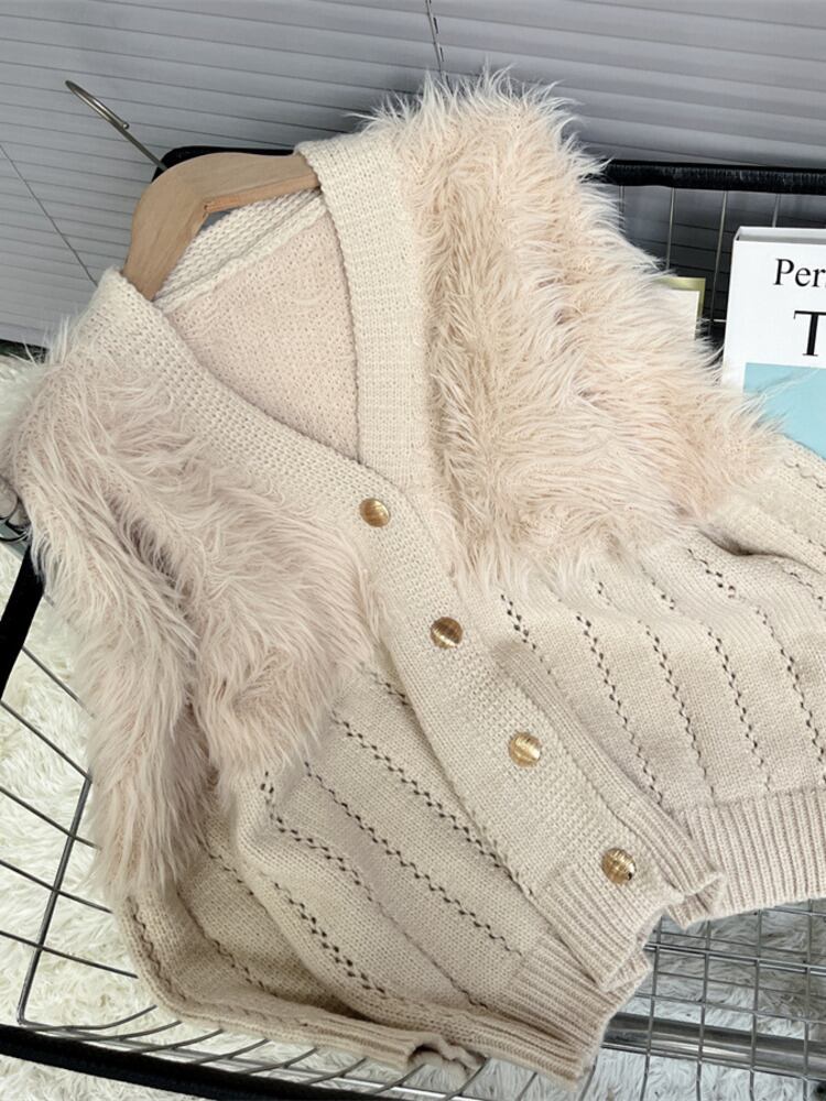 [EWQ] フェイクミンク毛皮ようカーディガン シングルブレスト セーター レディース スプライシング V ネック 厚手 暖かい トップス 秋冬 23A6295 オータム 秋物 ウィンター 冬物 ファー Vネック