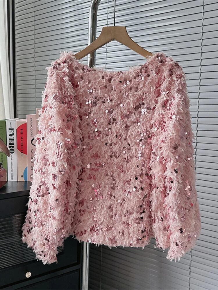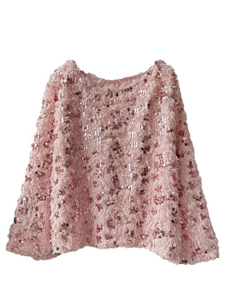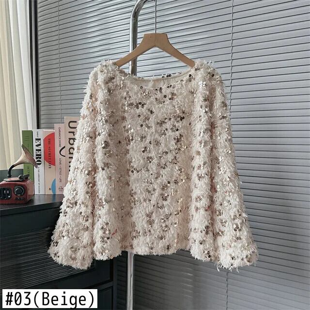 [EWQ] ゆったり O ネック スパンコール キラキラ ニット プルオーバー セーター レディース スプライス 長袖ジャンパー 秋冬 23A6303 ロング オータム 秋物 ウィンター 冬物 Oネック