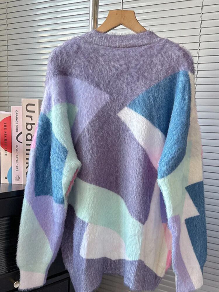 [EWQ] ルーズカラーコントラストフェイクミンクカシミヤニットプルオーバーセーターレディースOネックジャンパー秋冬6276 オータム 秋物 ウィンター 冬物 ファー