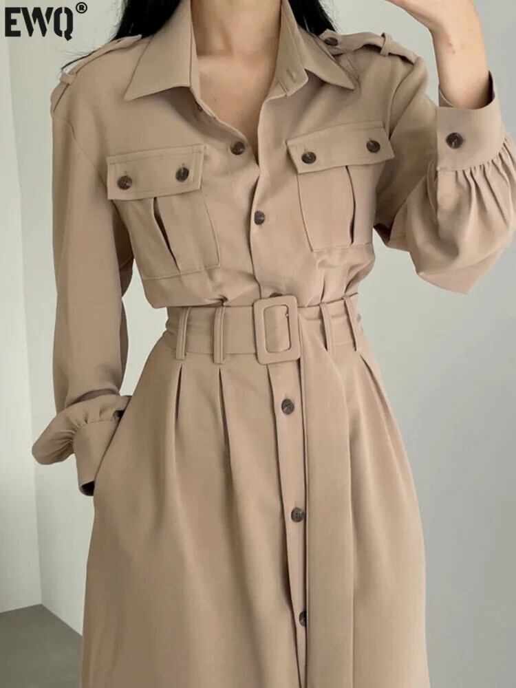 [EWQ] 気質ラペル シングルブレスト ポケット レースアップ ウエスト スリム 長袖 ワークシャツ ロングドレス 秋 春 16U6504 スプリング 春物 オータム 秋物