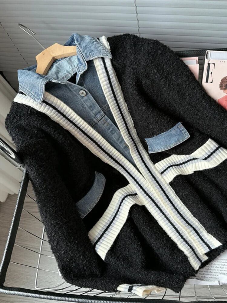 [EWQ] ストリート オーバーサイズ デニム ニット パッチワーク ジャケット コントラストカラー シングルブレスト ウォメコート 秋冬 3A63 オータム 秋物 ウィンター 冬物