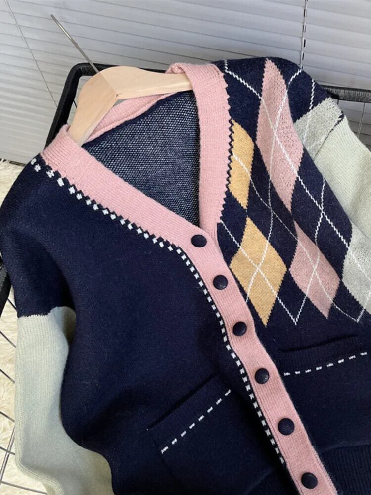 [EWQ] V ネック非対称菱形チェック柄ビッグサイズニットセーターカーディガンシングルブレストコート秋冬 23A6297 オータム 秋物 ウィンター 冬物 Vネック