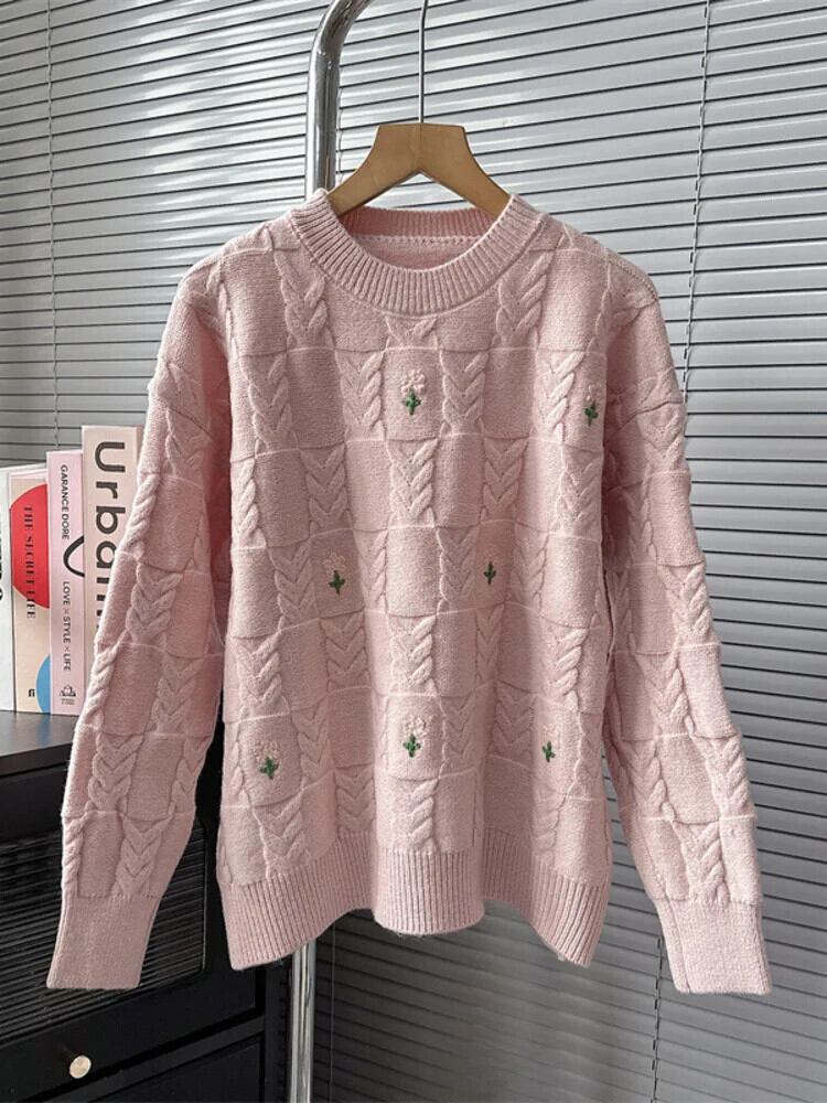 [EWQ] 刺繍花柄ラウンドネックニットプルオーバーセーターシンプル防寒着ジャンパーレディース秋冬23A6293 レッド オータム 秋物 ウィンター 冬物 Oネック