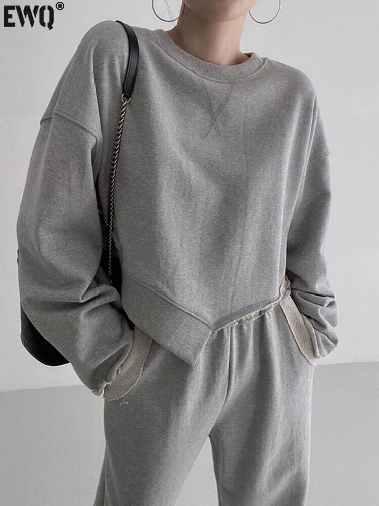 [EWQ] 2 点セット不規則黒白チェック柄スウェット + ウエスト緩いズボン秋冬 16U4952 ホワイト ブラック シャツ オータム 秋物 ウィンター 冬物