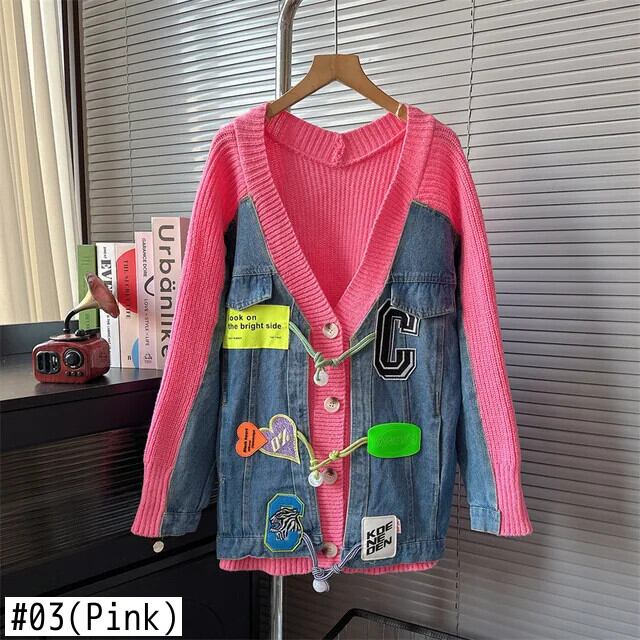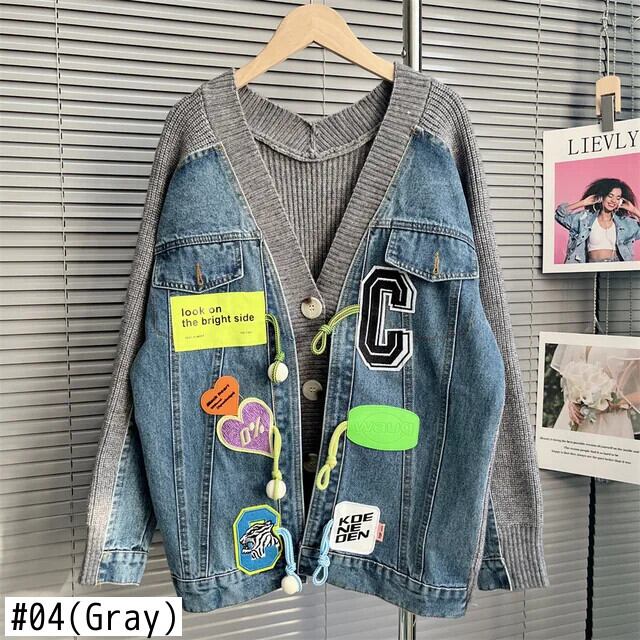 [EWQ] Vネック シングルブレスト デニム スプライス ニット カーディガン セーター レディース アップリケ コート トップス 秋冬 23A6292 オータム 秋物 ウィンター 冬物