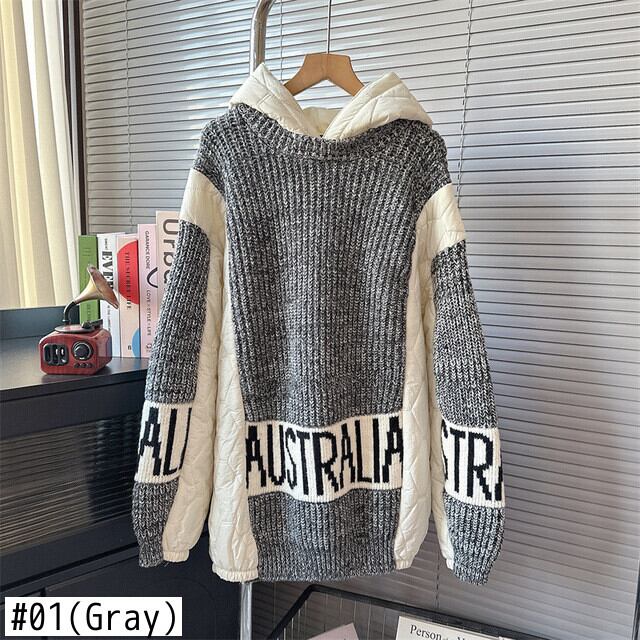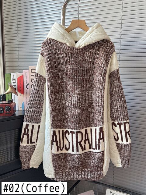 [EWQ] フード付きレタースプライスコントラストカラーニットプルオーバー綿パッド入りセーターレディースジャンパー秋冬23A6308 コットン オータム 秋物 ウィンター 冬物