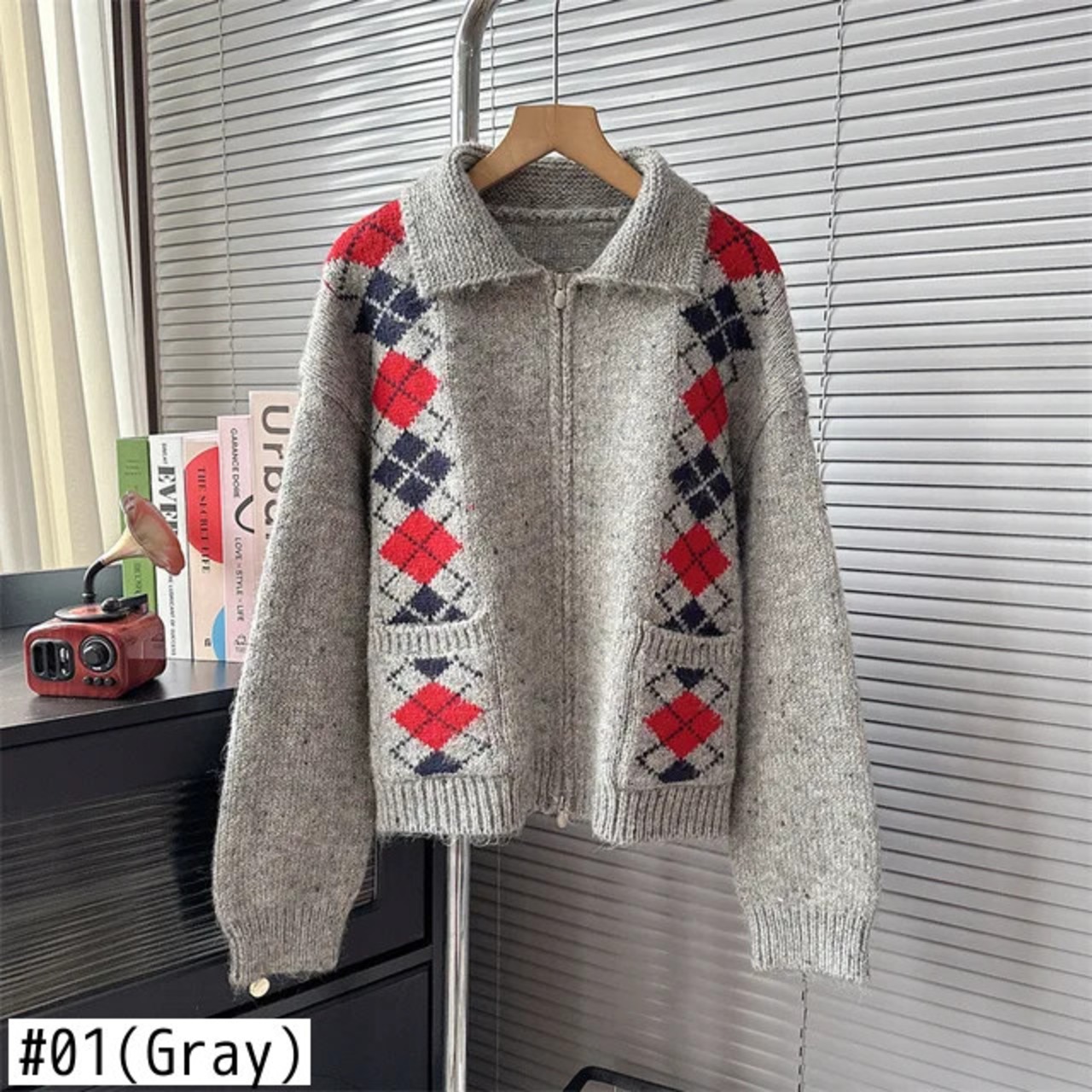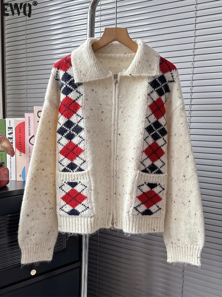 [EWQ] ラペル ジッパー ジャカード カーディガン ニット セーター レディース ポケット 厚手 暖かい コントラスト カラー チェック柄 コート 秋冬 6294 オータム 秋物 ウィンター 冬物