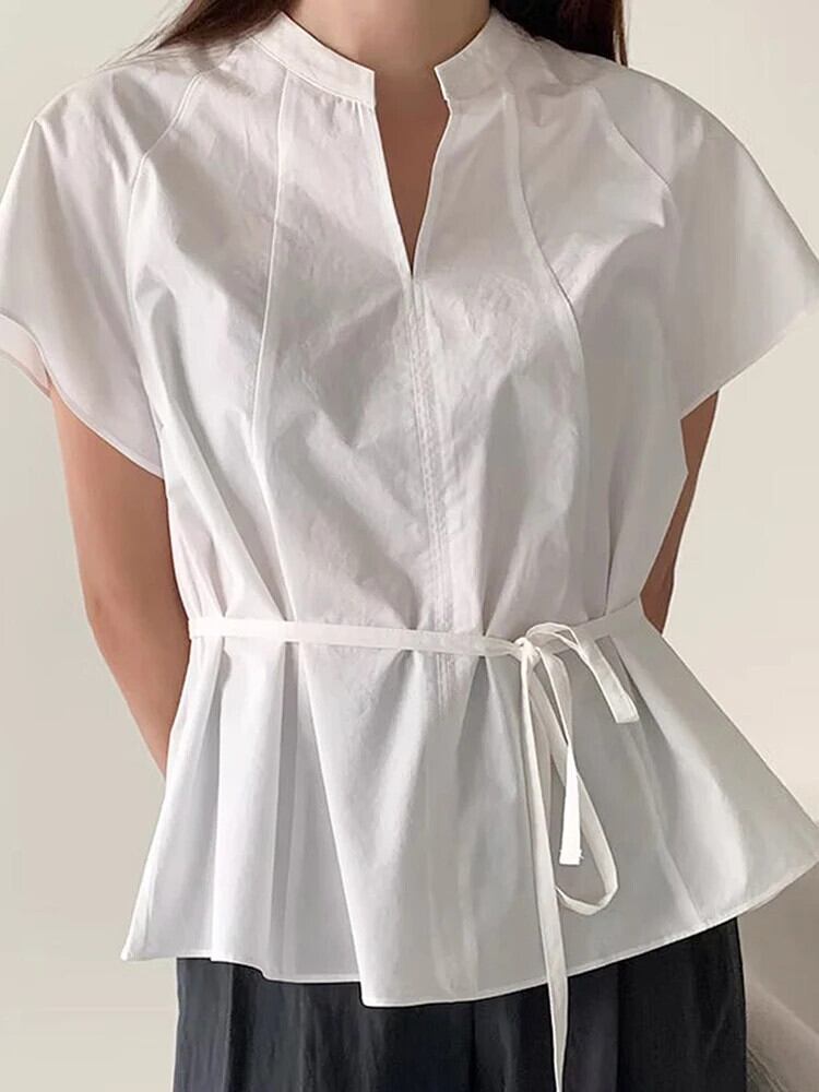 [EWQ] ハーフオープン O ネック レースアップ シャツ レディース ルーズ ソリッド カラー パッチワーク 半袖 夏潮トップ ショート ハーフスリーブ サマー 夏物 Oネック ソリッドカラー