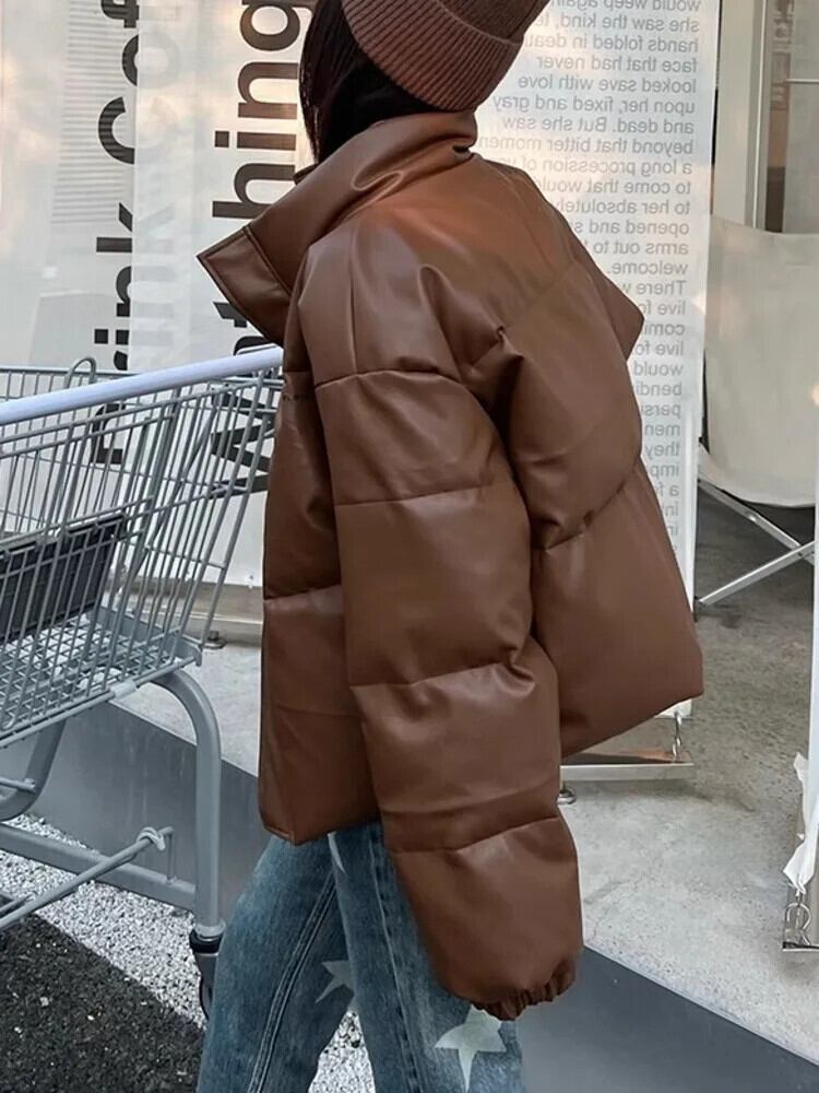 [EWQ] PU ブラックショートダウンジャケットルーズ暖かい綿パッド入りコートトップ秋冬厚手ダウンパーカー 16U5970 コットン オータム 秋物 ウィンター 冬物
