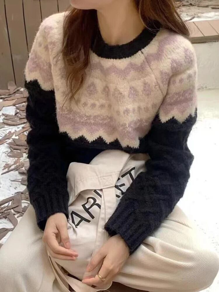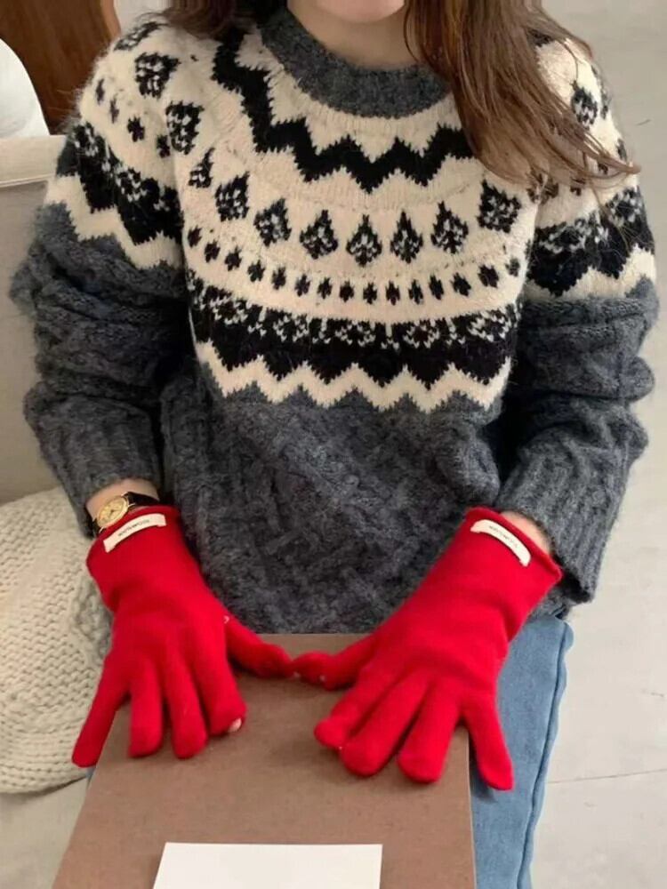 [EWQ]秋冬クリスマスOネック美しいレッドトップスコントラストカラージャガード厚手暖かいプルオーバーニットセーターU6498 オータム 秋物 ウィンター 冬物