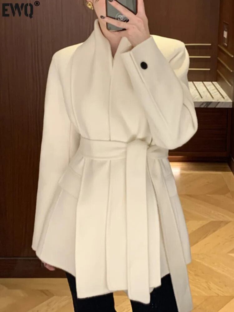 [EWQ] ブラックベージュ V ネックレースアップウエストスリム多用途長袖ウールコートジャケット秋冬 6U6540 ロング オータム 秋物 ウィンター 冬物 Vネック