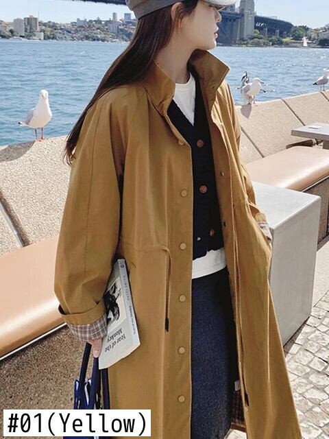 [EWQ] イエロー トレンチ コート レディース 長袖 ストライプ パッチワーク ルーズ ウインドブレーカー ジャケット 秋冬 16U5335 ロング オータム 秋物 ウィンター 冬物
