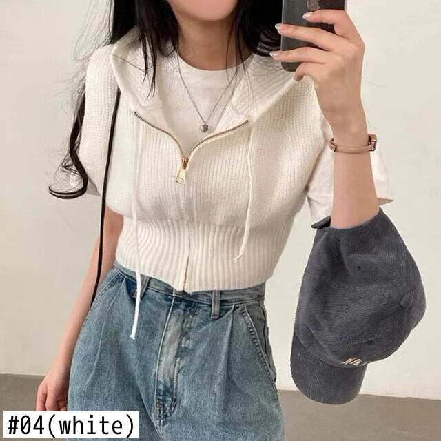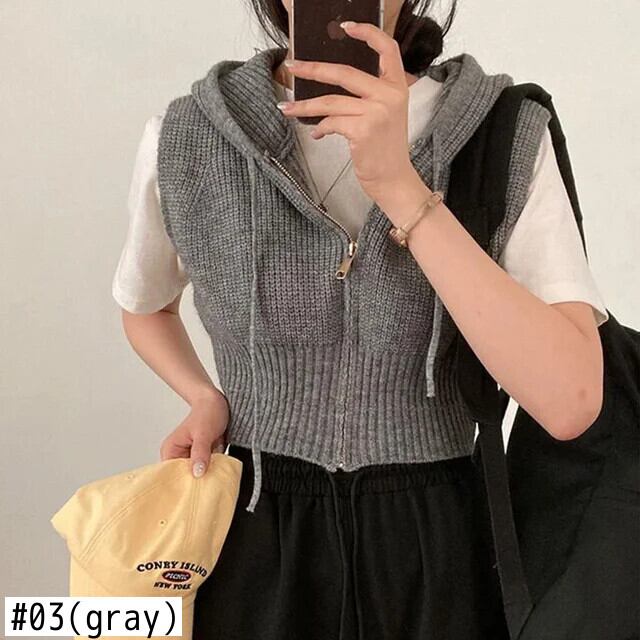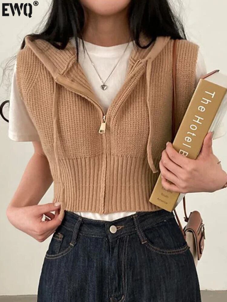 [EWQ] 巾着フード付きニットベストジップアップノースリーブショートニットチョッキ秋薄い潮 オータム 秋物