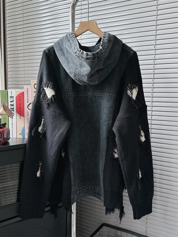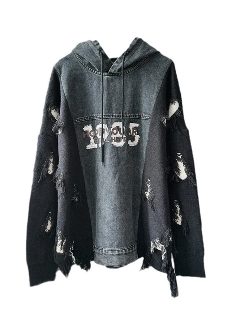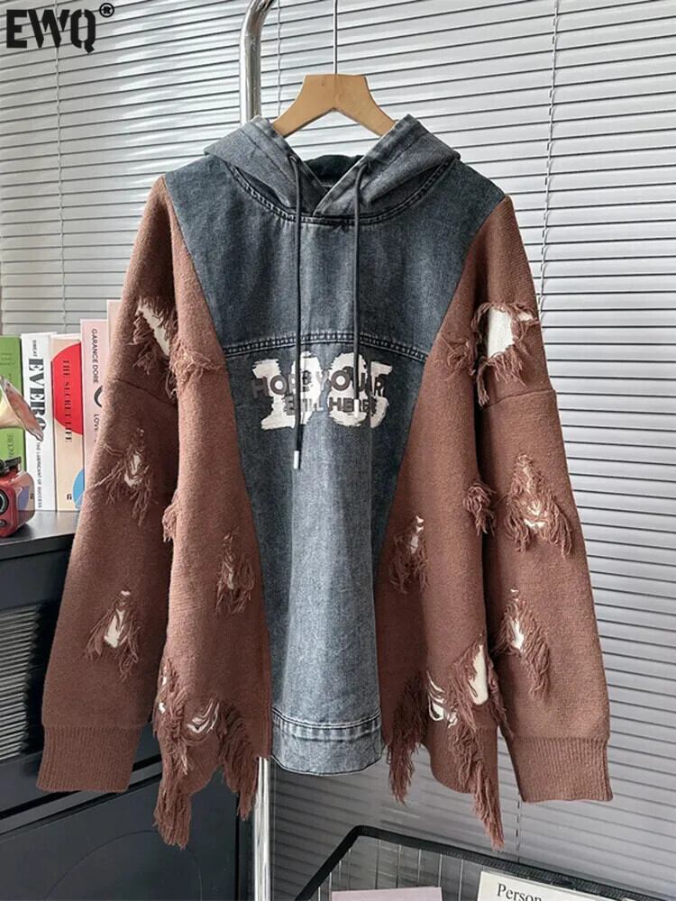 [EWQ] フェイク 2 ピース デニム スプライス セーター レディース ホールテル レター プリント フード付き プルオーバー ニット トップ 秋冬 16U5258 オータム 秋物 ウィンター 冬物