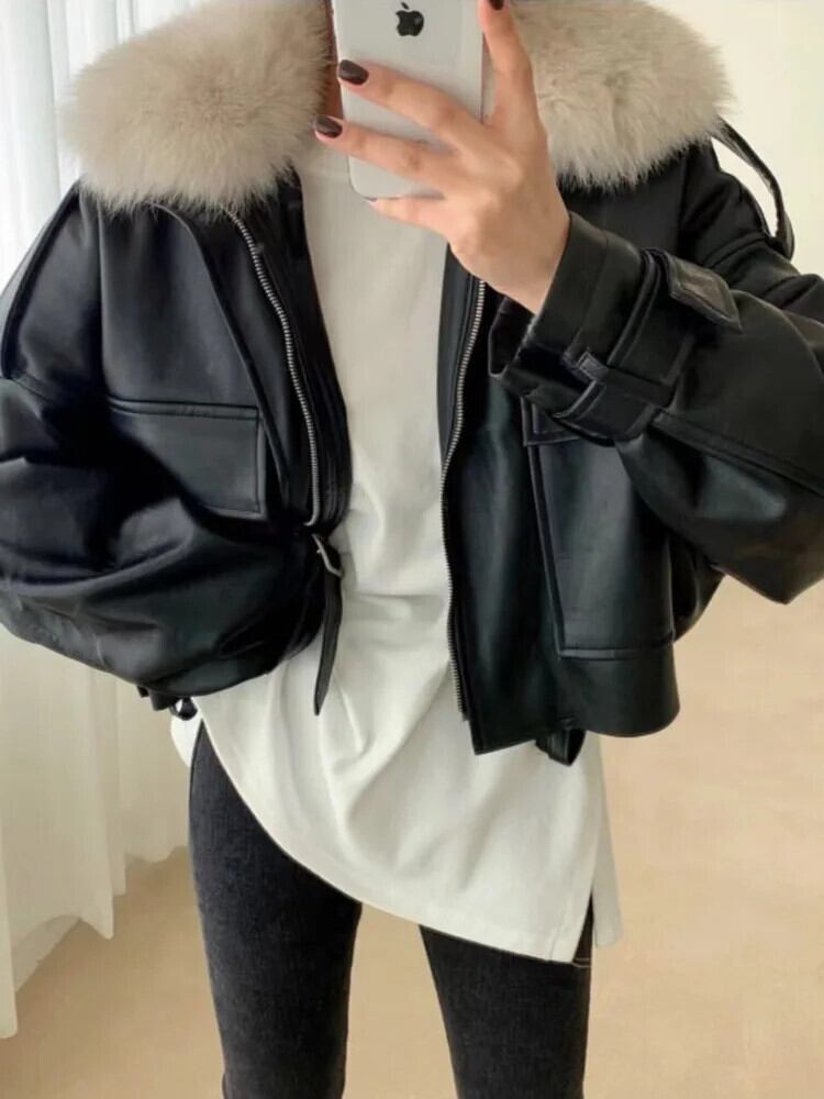 [EWQ] ストリート毛皮ラペルパッチワークジッパージャケットレザーボンバーオートバイラージポケットコート秋冬 U6488 オータム 秋物 ウィンター 冬物