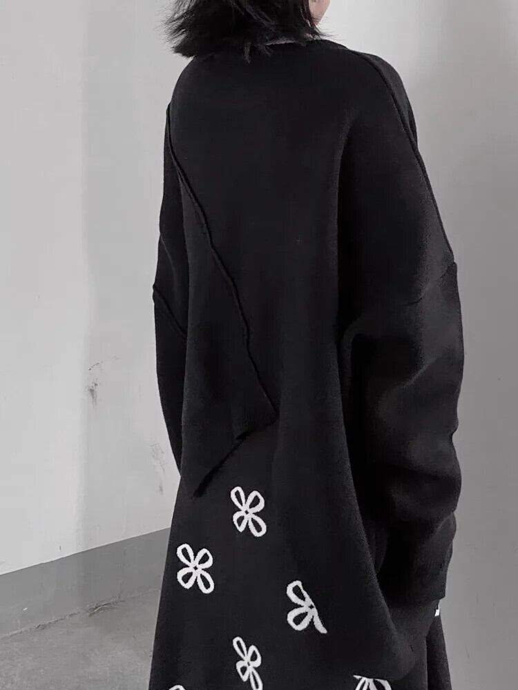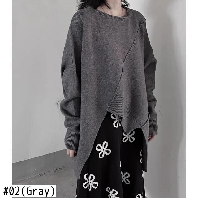 [EWQ] O ネックスプライシングブラックグレーソリッドカラールーズ不規則プルオーバーセータートップス秋冬 6U6289 オータム 秋物 ウィンター 冬物 Oネック