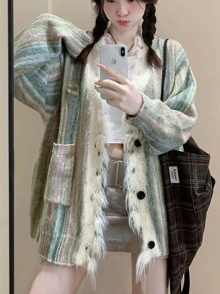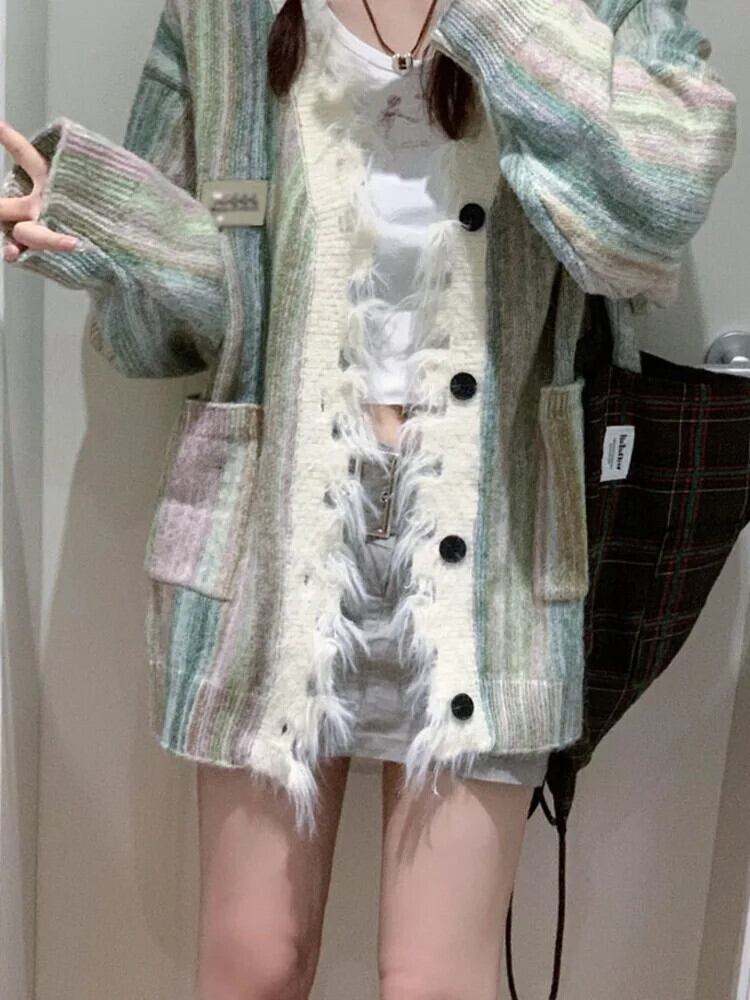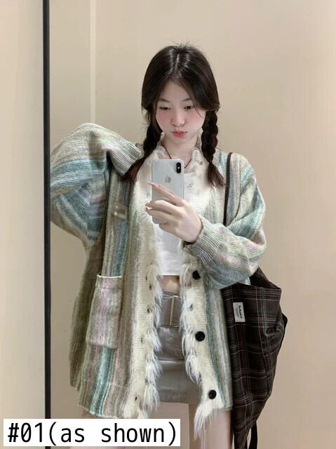 [EWQ] ストライプ シングルブレスト テル コントラストカラー 長袖 ポケット レディース カーディガン ニット セーター 秋冬 U6146 ロング オータム 秋物 ウィンター 冬物