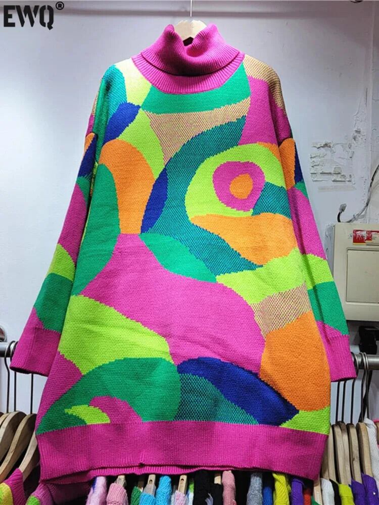 [EWQ] タートルネック厚手暖かいニットコントラストカラープルオーバーセータートップ秋冬 16U6280 オータム 秋物 ウィンター 冬物