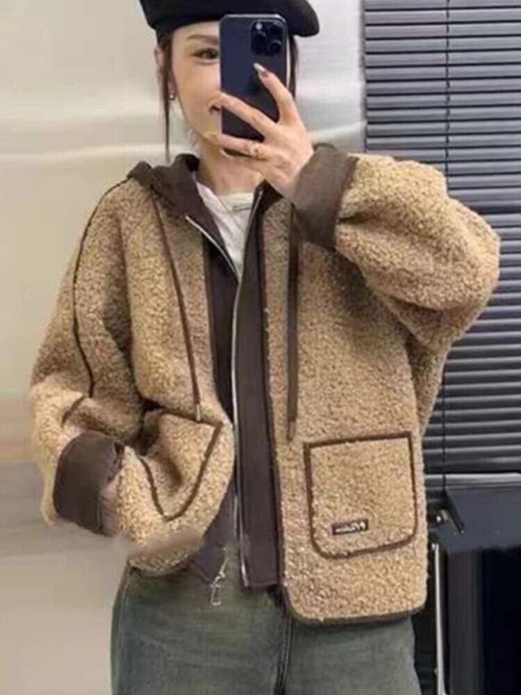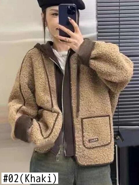 [EWQ] ヨーロッパファー一体型ショートジャケット秋冬ゆったりスリムコントラストカラーラムぬいぐるみフード付きコート16U5700 オータム 秋物 ウィンター 冬物 ヨーロピアン