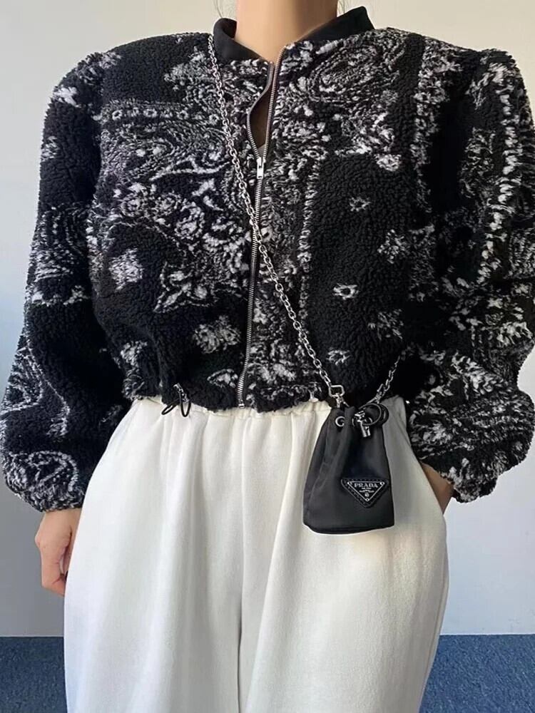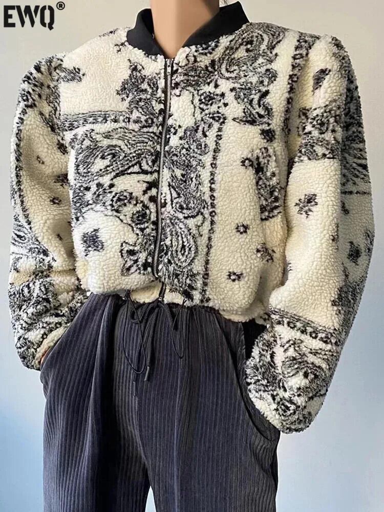 [EWQ] ジッパープリント柄ラムウールショートジャケット厚手暖かい婦人コート秋冬16U6590 オータム 秋物 ウィンター 冬物