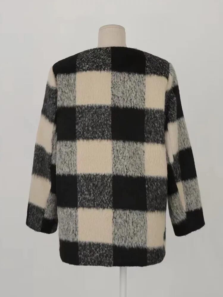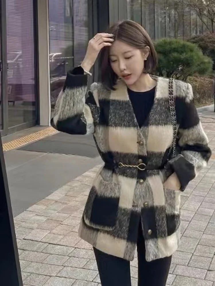 [EWQ] ストリート V ネックチェック柄コントラストカラーシングルブレストポケットウールコート暖かいジャケット秋冬 6U6592 オータム 秋物 ウィンター 冬物 Vネック