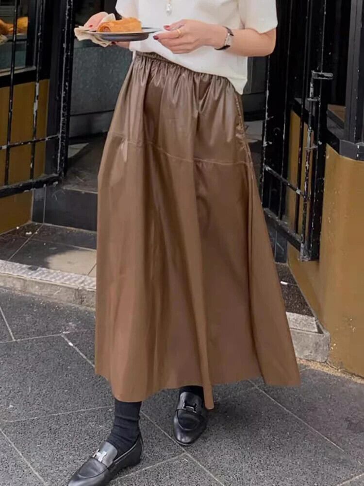 [EWQ] ストリートクールポケットウエストオールマッチソリッドカラー PU レザー大き裾レディーススカート秋冬 U6782 オータム 秋物 ウィンター 冬物
