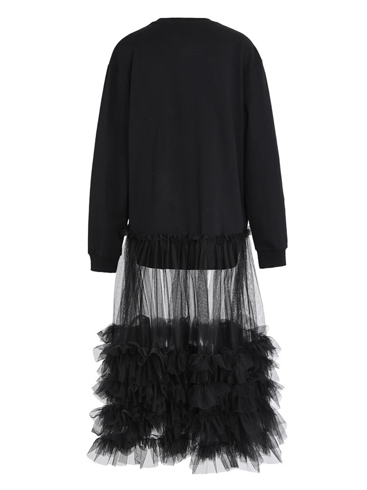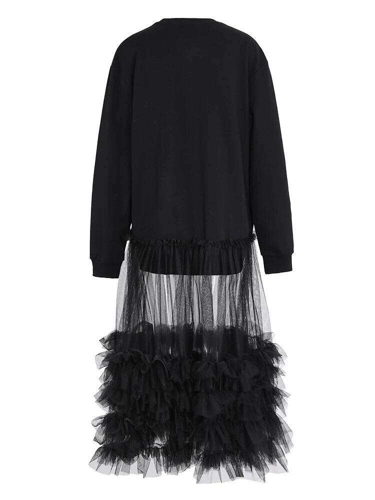 [EWQ] 甘いメッシュスプライススウェットシャツドレス長袖ビッグサイズ O ネック Vestidos 冬秋長さ 127 センチメートル ロング 大人ガーリー スウィート キュート カジュアル オータム 秋物 ウィンター 冬物 Oネック