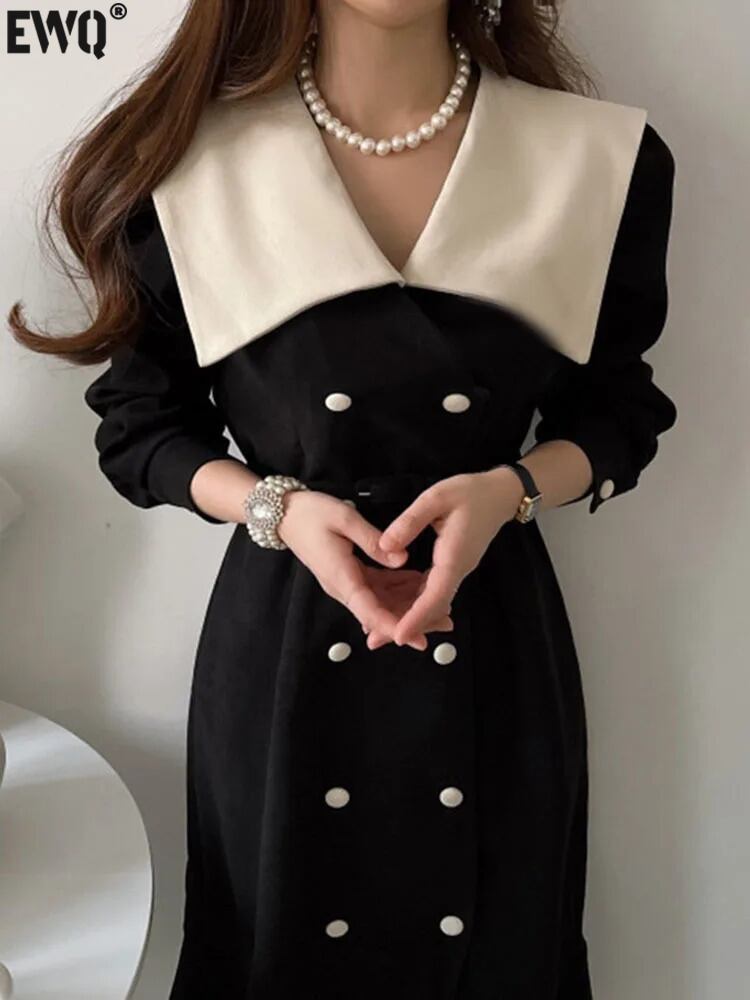 [EWQ] コントラストカラー大きラペルダブルブレストベルトウエストスリム長袖フィッシュテールドレス秋冬 16U6755 ロング オータム 秋物 ウィンター 冬物 ハーネス