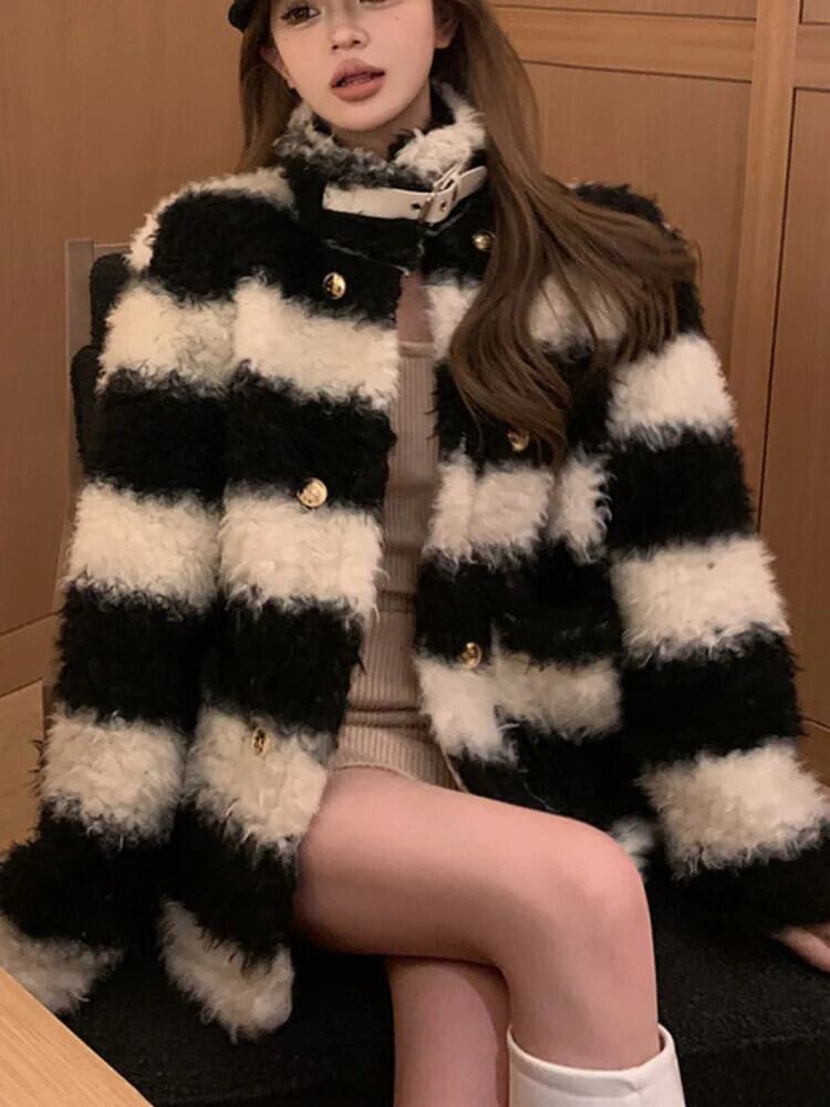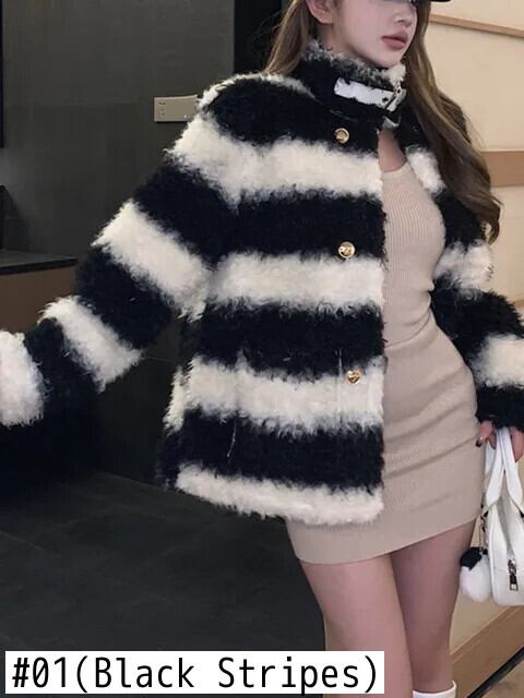 [EWQ] スタンドカラー ストライプ コントラストカラー レザー フェイクファー コート 婦人 アウター 秋冬 16U6759 オータム 秋物 ウィンター 冬物