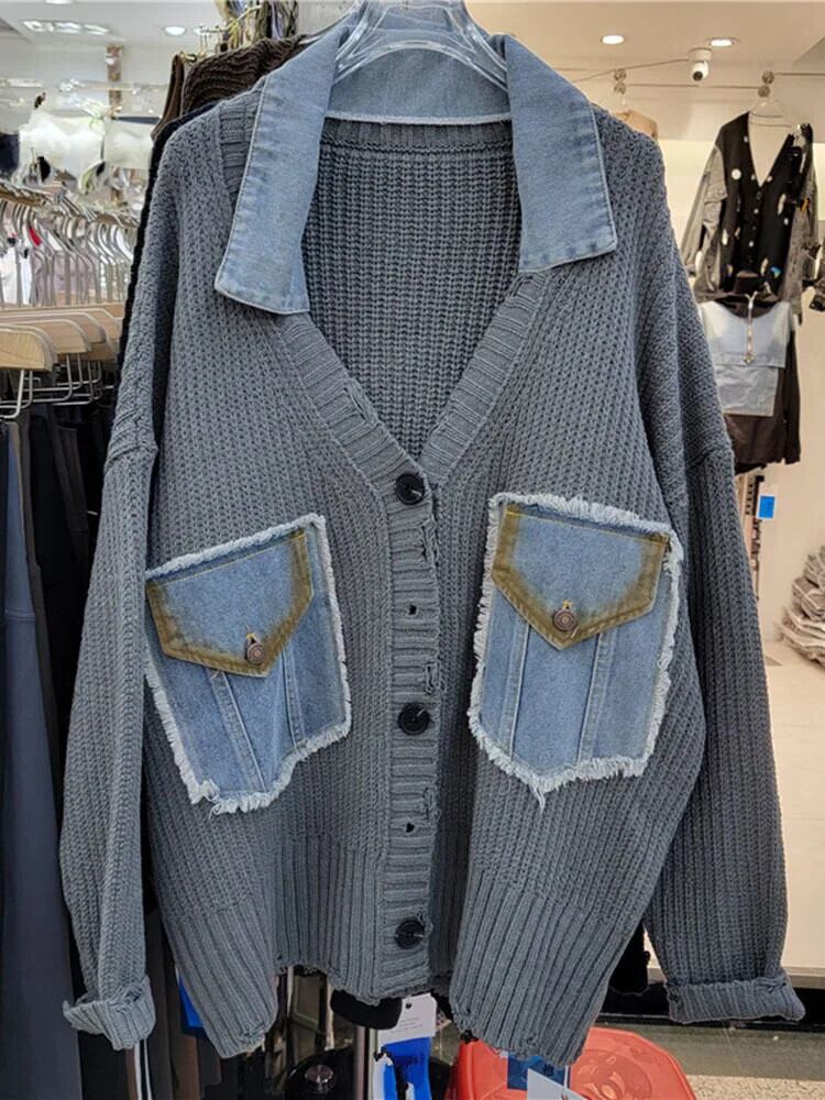 [EWQ] コントラストカラースプライスデニムニットカーディガンセータージャケットコートビッグサイズ上着秋冬 U5829 オータム 秋物 ウィンター 冬物