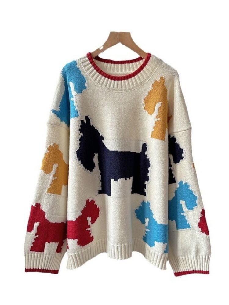[EWQ] カラフルジャカード漫画ニットプルオーバーセーター O ネック長袖ニットジャンパー秋冬 U6815 ロング オータム 秋物 ウィンター 冬物 Oネック