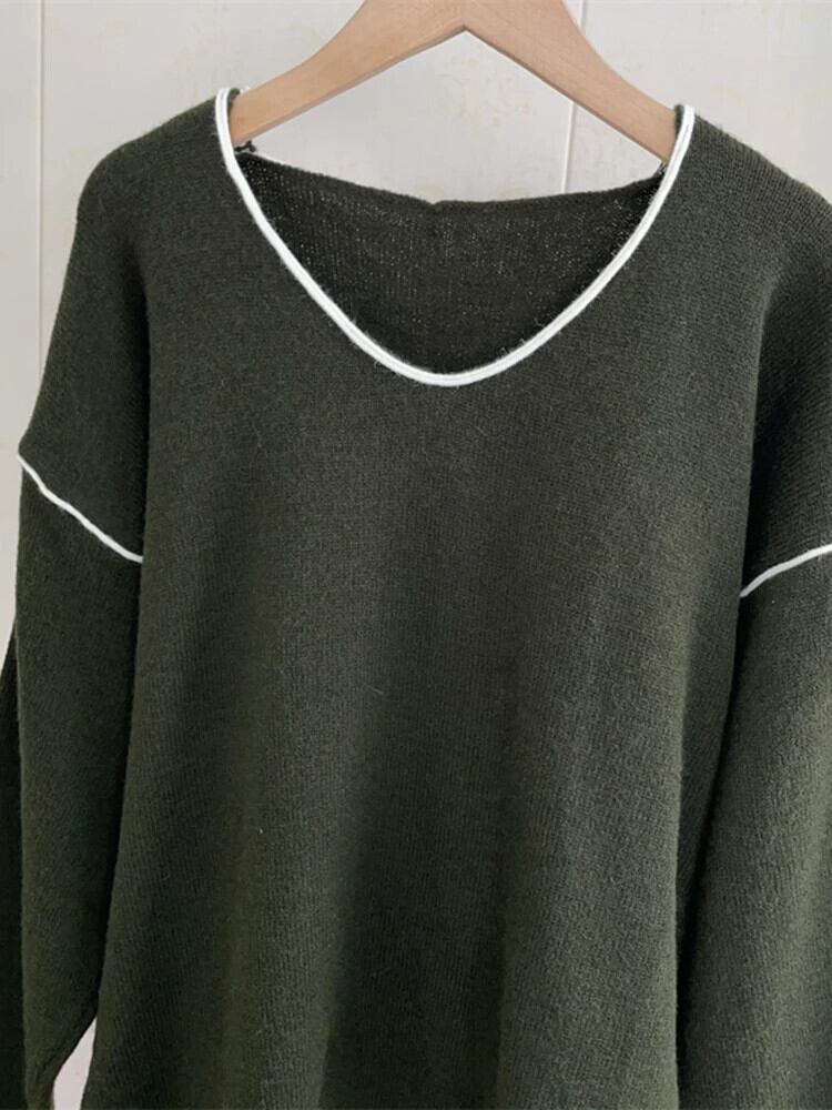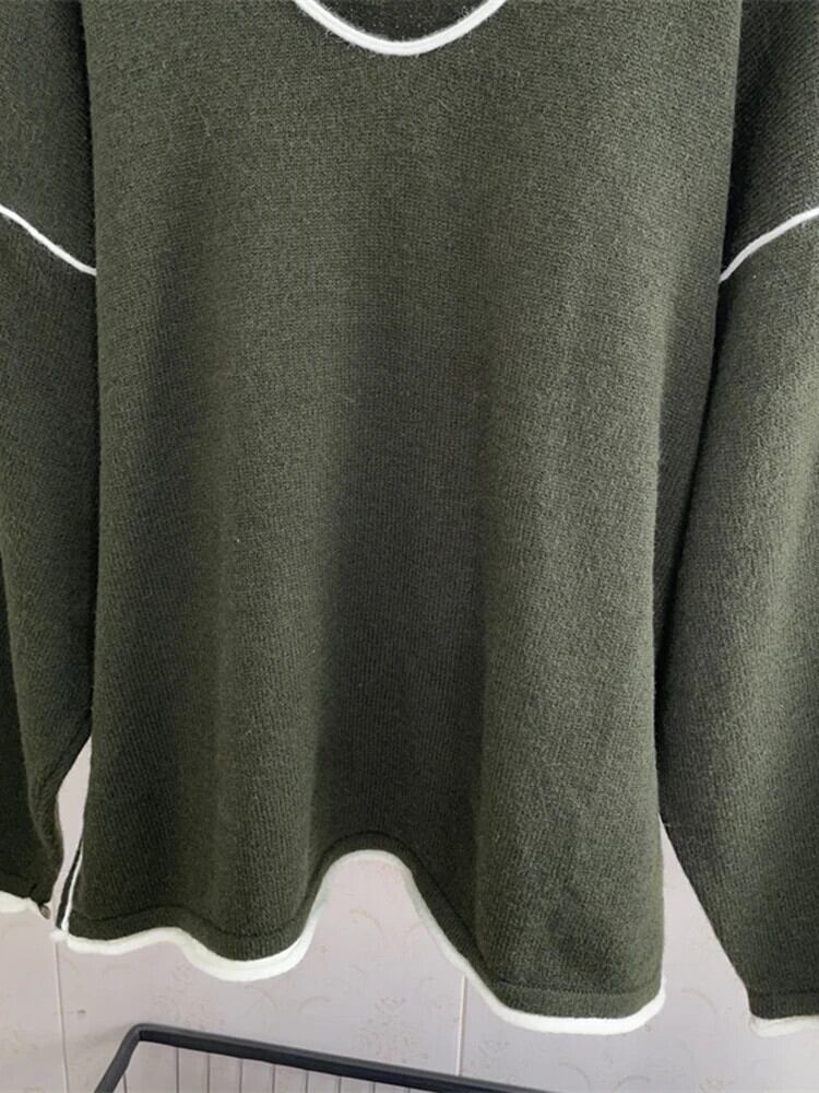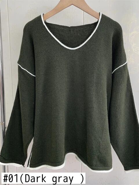 [EWQ] コントラストカラー トップステッチ O ネック プルオーバー セーター ルーズ 長袖 ニット トップス 秋 16U5521 ロング オータム 秋物 Oネック