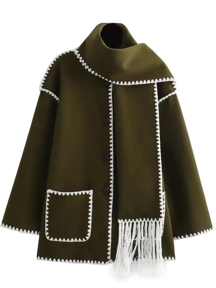 [EWQ] 長袖ブライトスレッドトレンドレディース暖かいルーズウールコート、スカーフ付き秋ジャケット ロング オータム 秋物