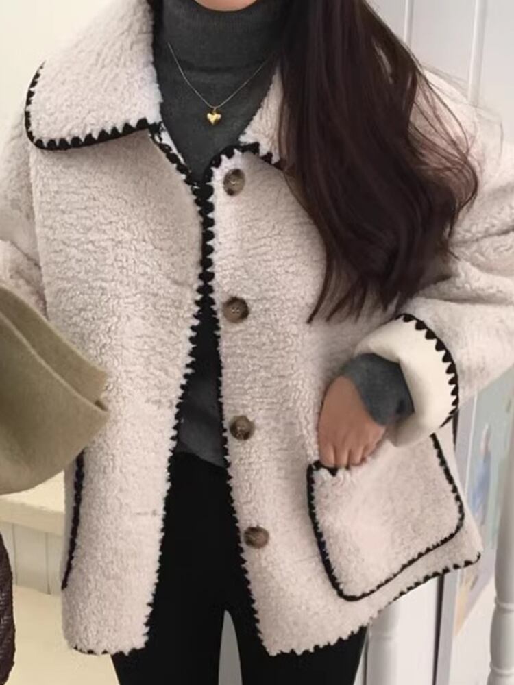 [EWQ] コントラストカラーエッジラペルシングルブレスト厚手暖かいラムウールコートルーズウールブレンドジャケット秋 オータム 秋物