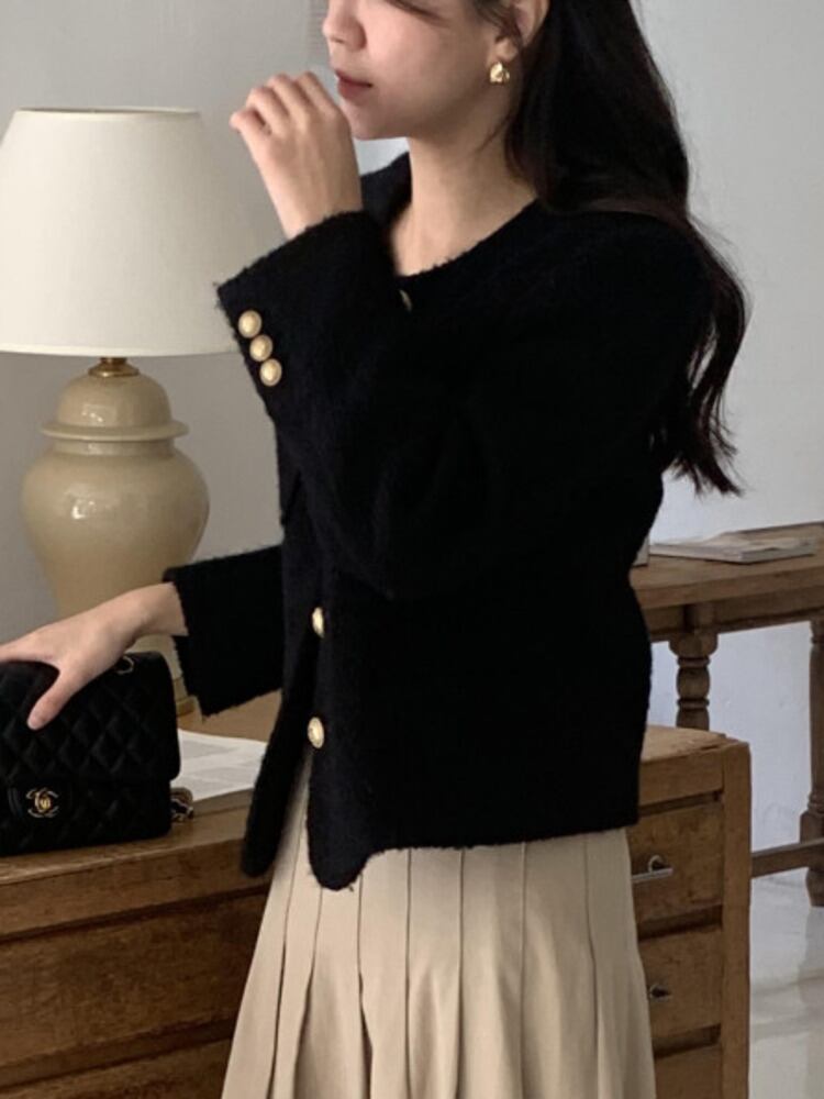 [EWQ] 甘い気質 O ネックメタルボタンマルチポケットルーズオールマッチツイードショートコートトップ秋冬 16U5922 大人ガーリー スウィート キュート カジュアル オータム 秋物 ウィンター 冬物 Oネック ポケット多め