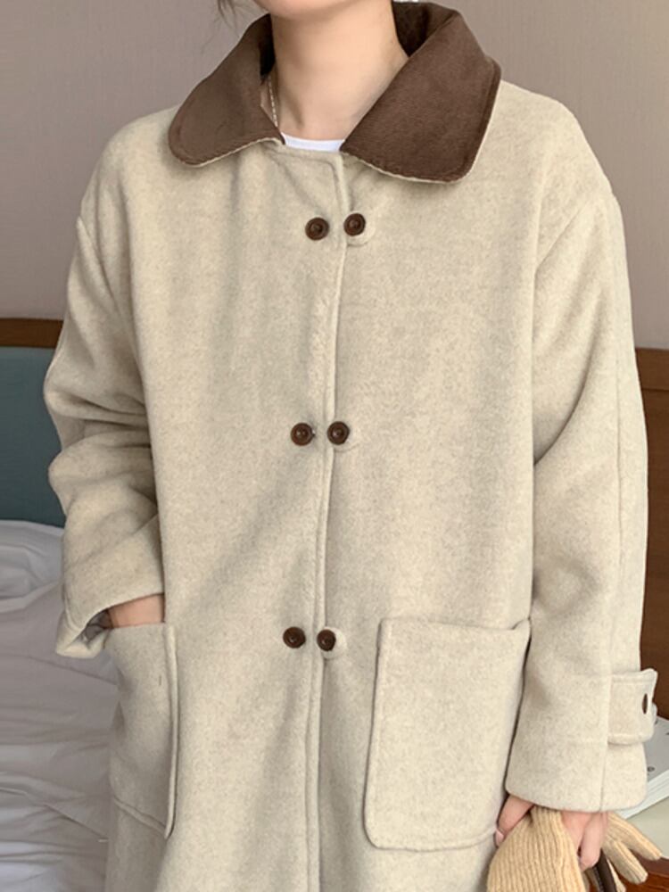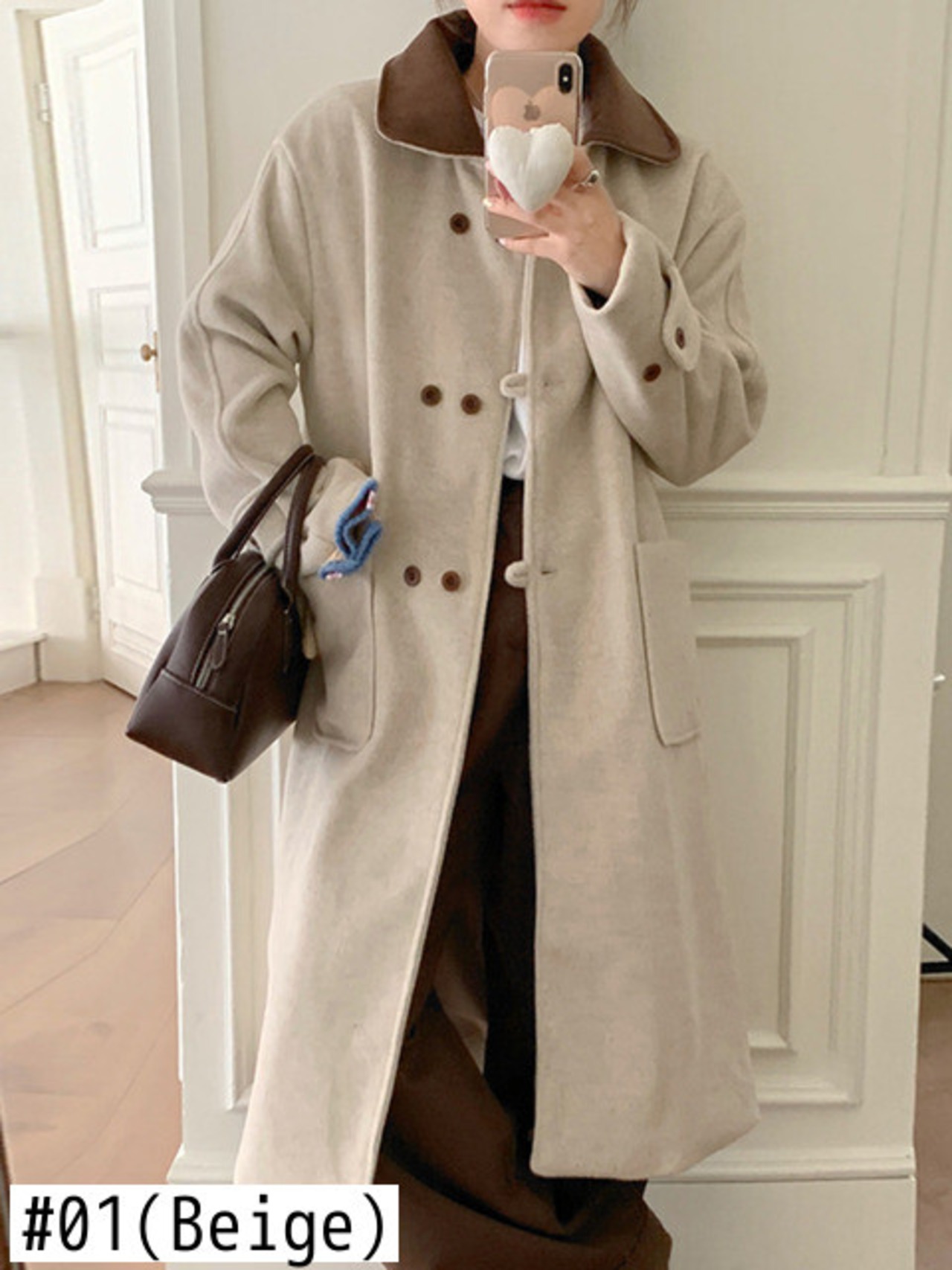 [EWQ] ストリート 長袖 ダブルブレスト ラペル コントラストカラー レディース オーバーコート ジャケット アウター 秋冬 16U5960 ロング オータム 秋物 ウィンター 冬物