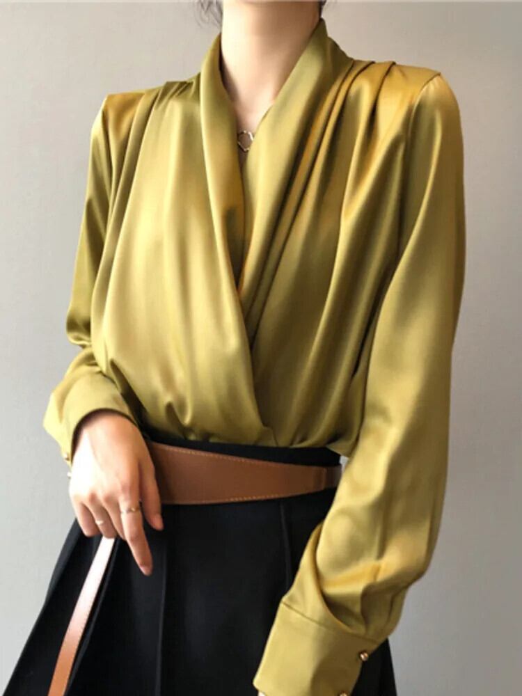 [EWQ] 気質オフィスレディソリッド長袖ビジネスサテン V ネックブラウス秋 16Y752 ロング オータム 秋物 Vネック ソリッドカラー 会社 学校 通勤や通学にも