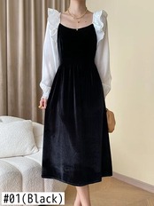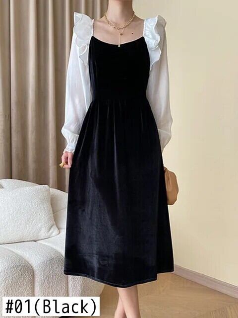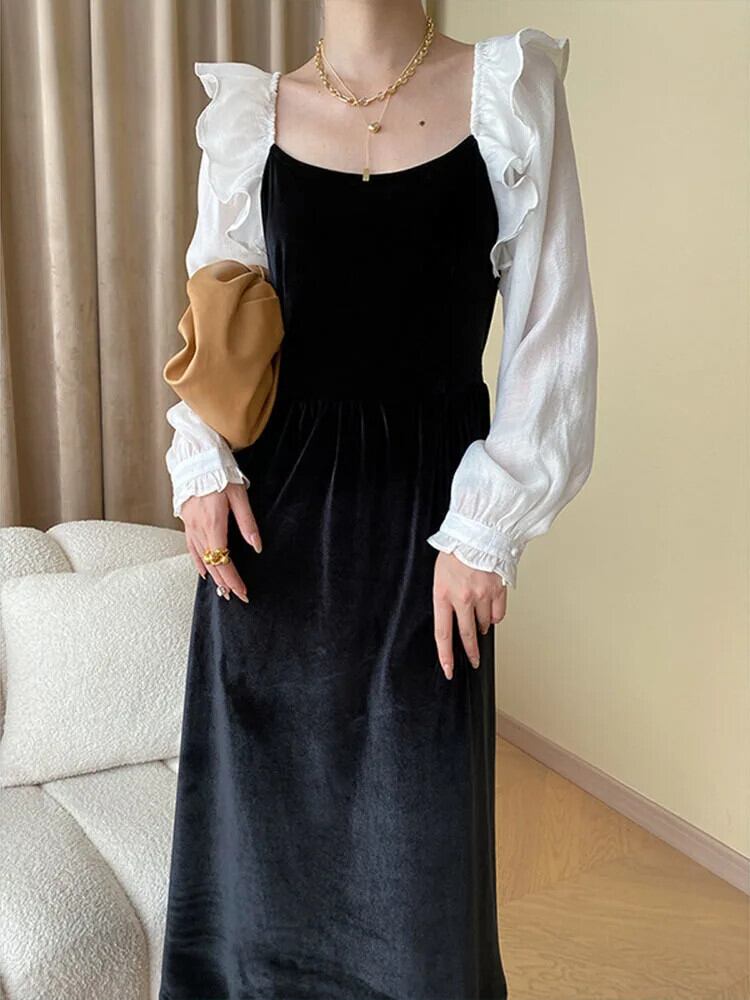 [EWQ] ブラック ホワイト コントラスト カラー スクエアカラー ロング ロータス パフ スリーブ ベルベット スプライシング レディース ドレス 秋冬 16U5527 オータム 秋物 ウィンター 冬物 スクウェア