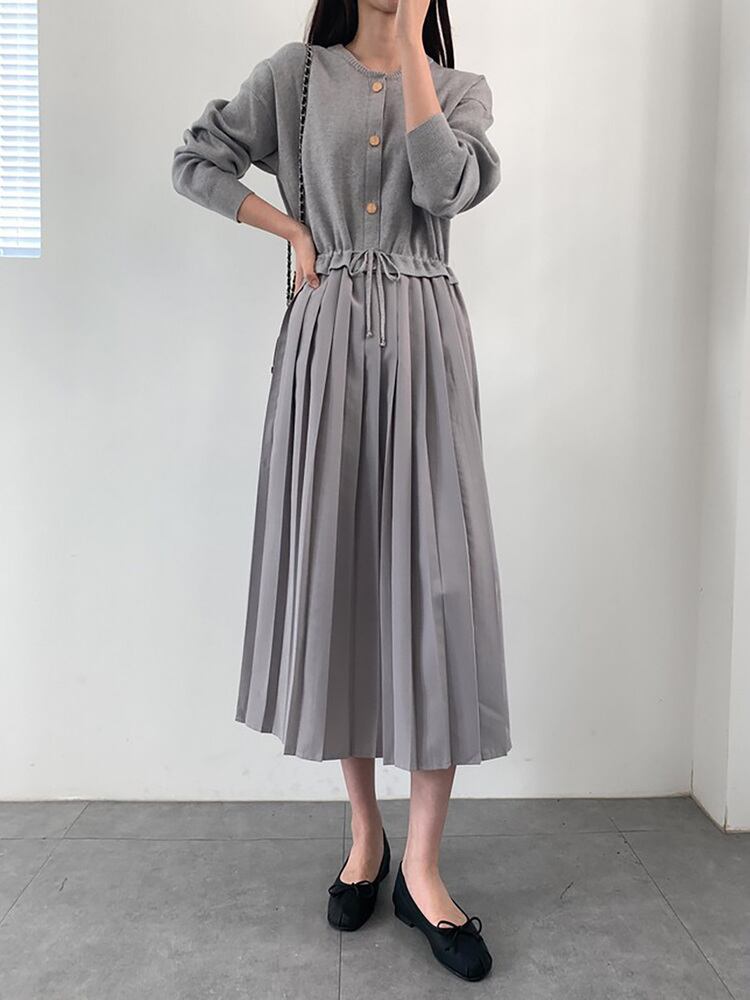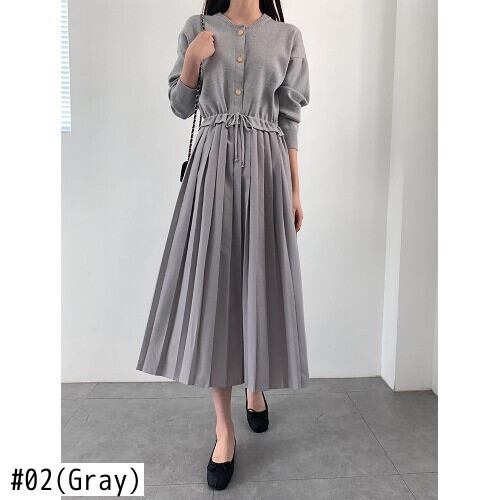 [EWQ] Oネック シングルブレスト 巾着 ミドル丈 ニット プリーツ ワンピース レディース 秋冬 16U6857 オータム 秋物 ウィンター 冬物
