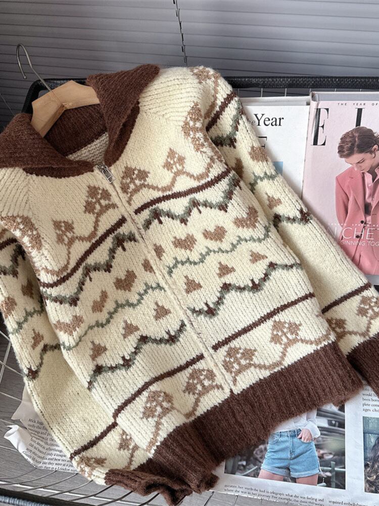 [EWQ] ラペルジッパー ジャガード ニット カーディガン セーター ジャケット コントラストカラー ルーズ 長袖 コート 秋冬 6U6814 ロング オータム 秋物 ウィンター 冬物